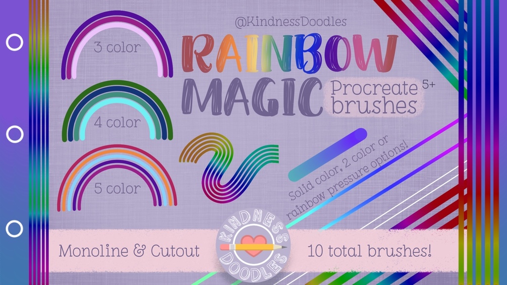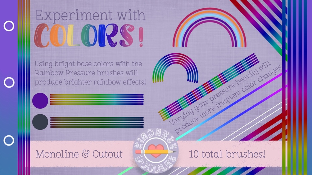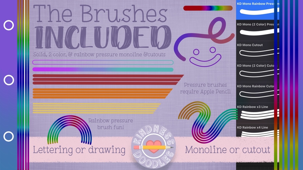 There are 10 monoline brushes included in solid & cutout styles and 2-color pressure & rainbow pressure to provide you with a wide variety of fun brushes to step up your drawing or lettering game.